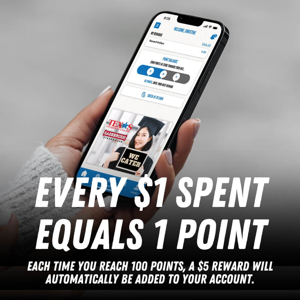 After you have signed up to become a member, you will earn points on all food and non-alcoholic beverage purchases. You will earn 1 point for every $1 spent at Texas Steakhouse or Sagebrush Steakhouse of Dunn, receive a $5 reward every time you reach 100 points, receive a free dessert on your birthday, and have access to exclusive “just because” bonuses!